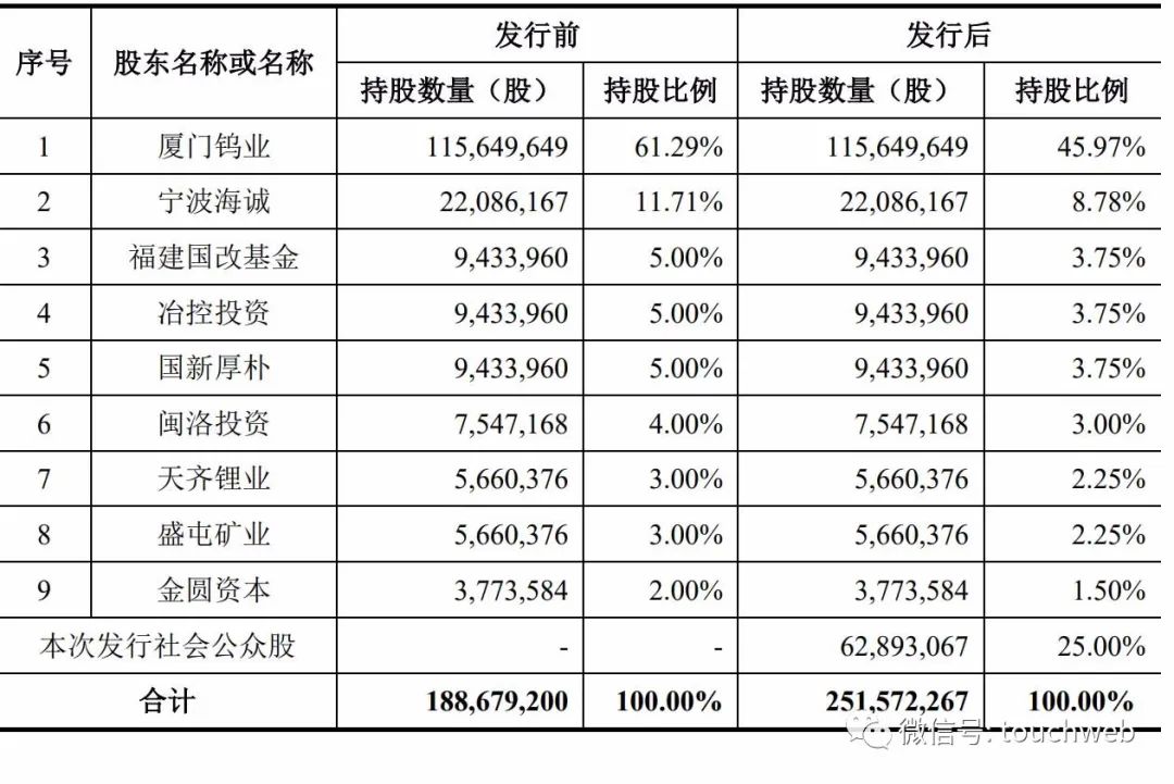 IPO后,厦门钨业持股为45.97%,宁波海诚持股为8.78%,福建国改基金、冶控投资、国新厚朴分别持股为3.75%,闽洛投资持股为3%,天齐锂业、盛屯矿业分别持股为2.25%,金圆资本持股为1.50%。