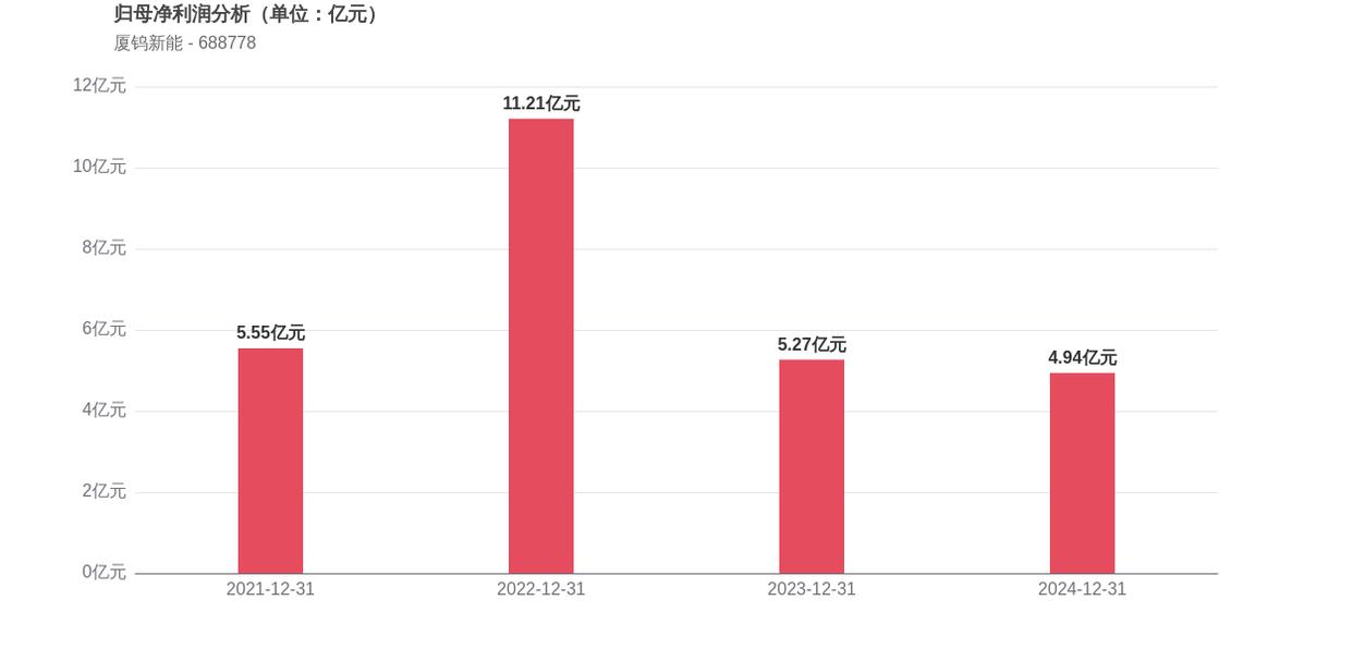 厦钨新能上市的2021年,当年实现归母净利润5.55亿元。截至最新完整财年的2024年,公司实现4.94亿元的归母净利润,近年累计下降了11.03%。这4年间,厦钨新能无一年份出现亏损。