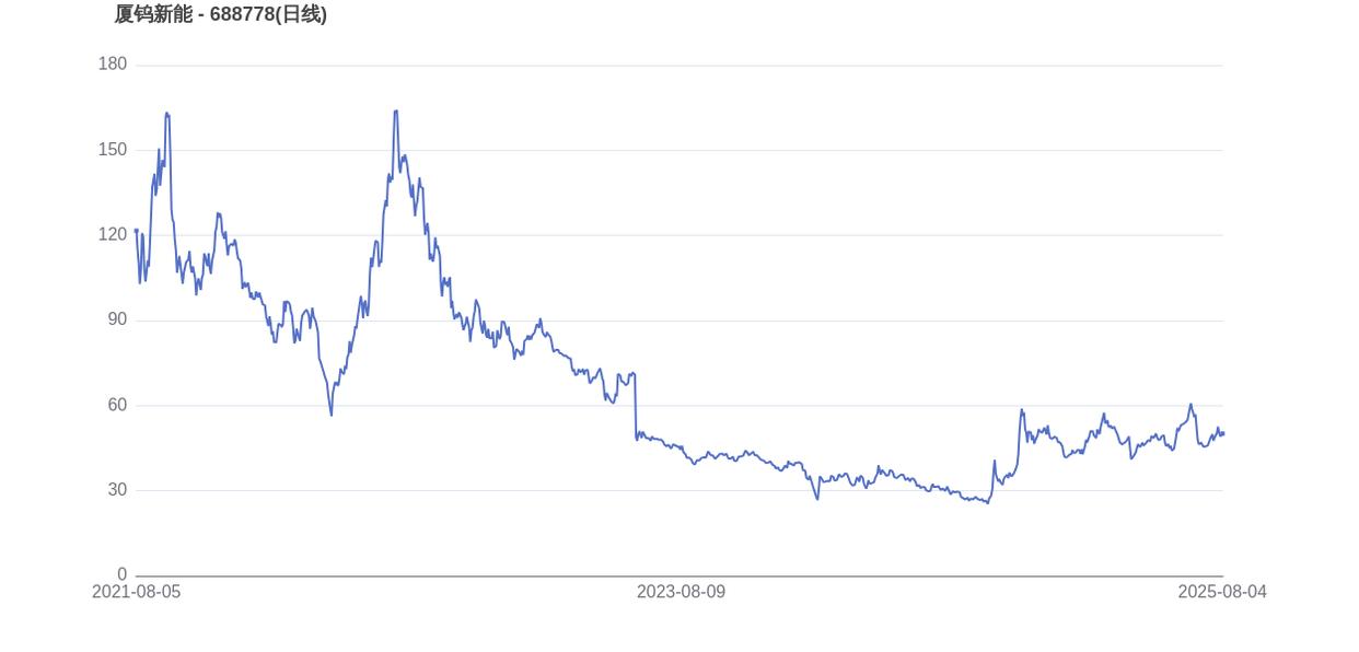 2022年8月18日,厦钨新能的市值巅峰达到433.39亿元,股价也顺应升至144.2元。而至8月4日收盘,厦钨新能的股价为50.14元,市值为253.05亿元,相比峰值时期市值减少180.34亿元,市值蒸发了41.61%。