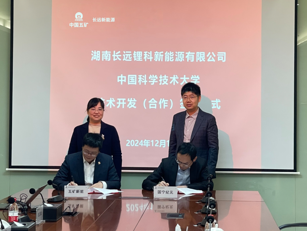12月16日,五矿新能源材料(湖南)股份有限公司(以下简称五矿新能)与中国科学技术大学(以下简称中科大)马骋教授科研团队及其创立的合肥固宁纪元新能源科技有限公司(以下简称固宁纪元)合作签约仪式成功举行。五矿新能副总经理张瑾瑾,中科大教授、固宁纪元董事长、首席科学家马骋出席仪式。