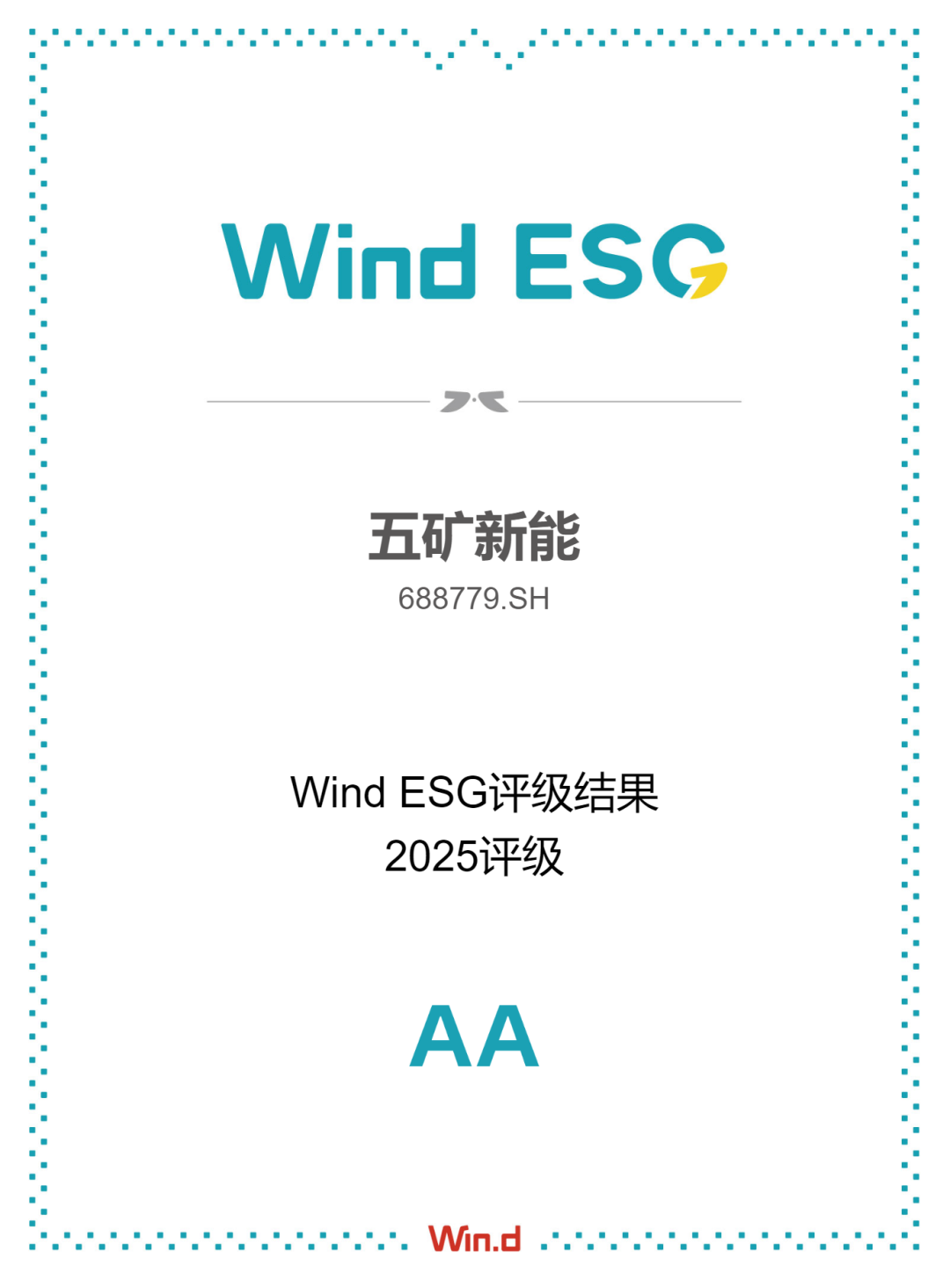 近日,五矿新能源材料(湖南)股份有限公司(证券代码:688779.SH)在2024年度万得(Wind)ESG评级中实现显著提升,由BBB级跃升至AA级,成功跻身国内同行业ESG评级最高梯队。此次评级提升充分彰显了公司在环境责任(E)、社会责任(S)及公司治理(G)三大维度的卓越表现,标志着公司在可持续发展领域的工作取得较好成果。