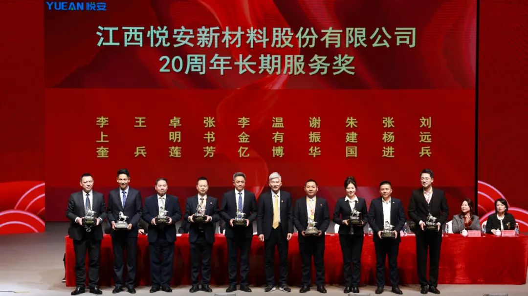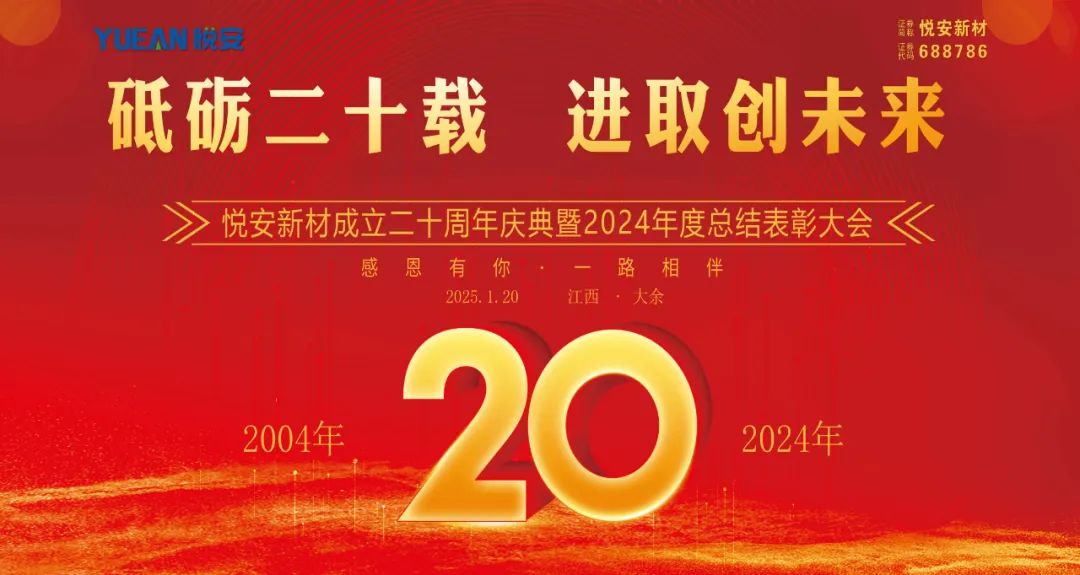 2025年1月20日,江西悦安新材料股份有限公司成立20周年庆典暨2024年度工作总结表彰大会在大余县丫山大龙山生态国际酒店隆重举行。相关领导、业界专家、合作伙伴以及公司全体员工欢聚一堂,共同庆祝这具有里程碑意义的重要时刻。