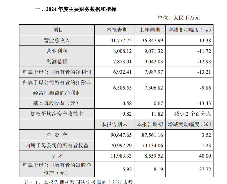 2024年,悦安新材营业总收入为4.18亿元,同比增长13.38%;归属于母公司所有者的净利润为6932.41万元,同比下降13.21%。