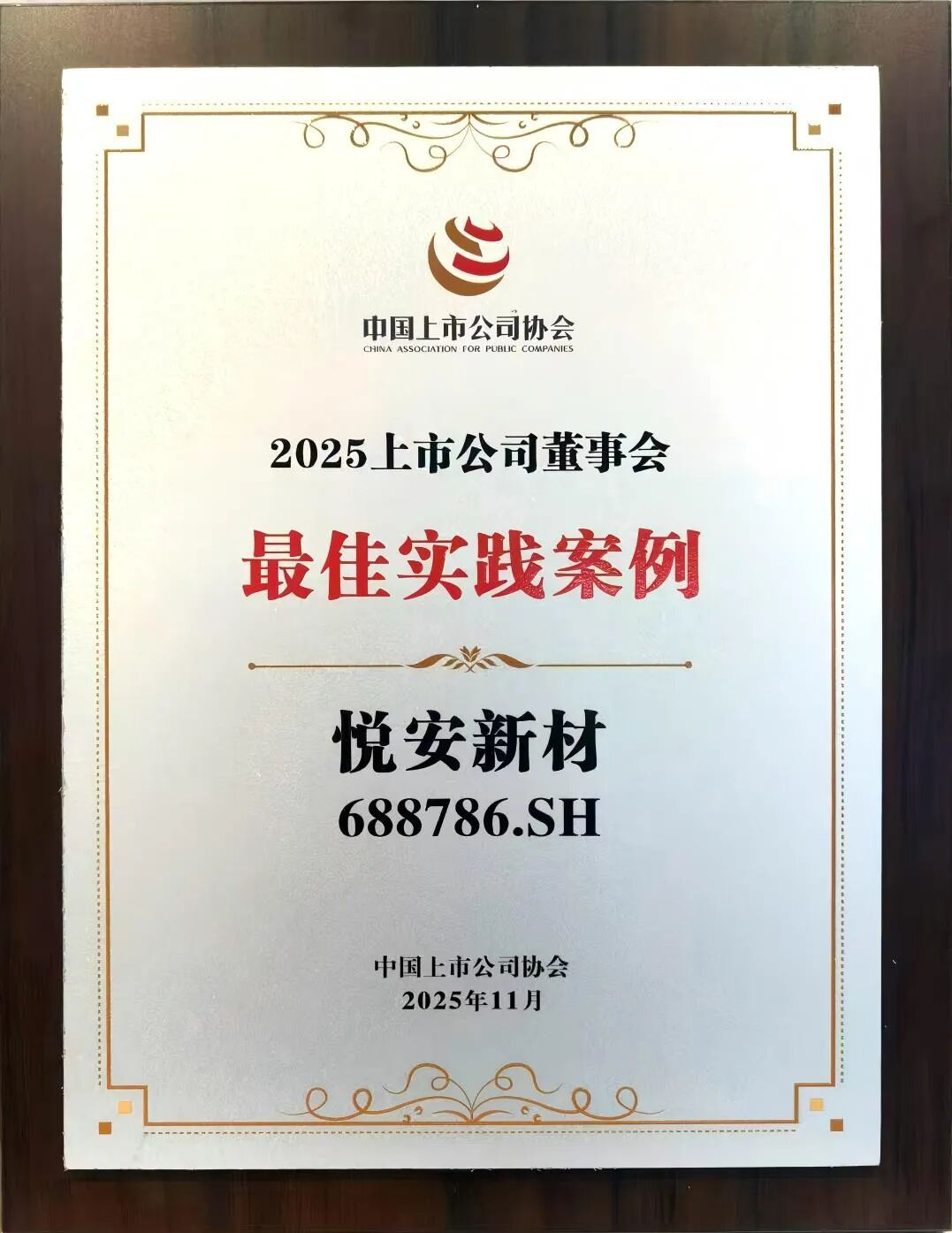 11月18日, 中国上市公司协会 发布了“2025上市公司董事会最佳实践案例”评选结果。江西 悦安新材 料股份有限公司(以下简称“ 悦安新材 ”)凭借科学完善的董事会运作和高效高质的企业发展,成功获评“2025上市公司董事会最佳实践案例”。此次获奖,是资本市场对公司董事会规范的治理水平、科学的战略规划能力以及有效的风险管控体系的高度认可。