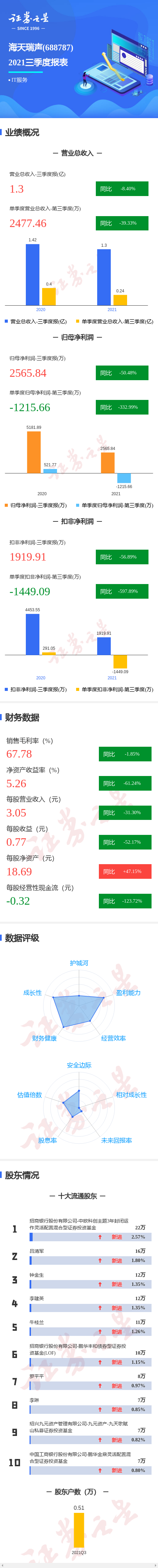 海天瑞声2021三季报显示,公司主营收入1.31亿元,同比下降8.4%;归母净利润2565.84万元,同比下降50.48%;扣非净利润1919.91万元,同比下降56.89%;其中2021年第三季度,公司单季度主营收入2477.47万元,同比下降39.33%;单季度归母净利润-1215.67万元,同比下降332.99%;单季度扣非净利润-1449.1万元,同比下降597.89%;负债率3.52%,投资收益707.24万元,财务费用41.04万元,毛利率67.78%。
