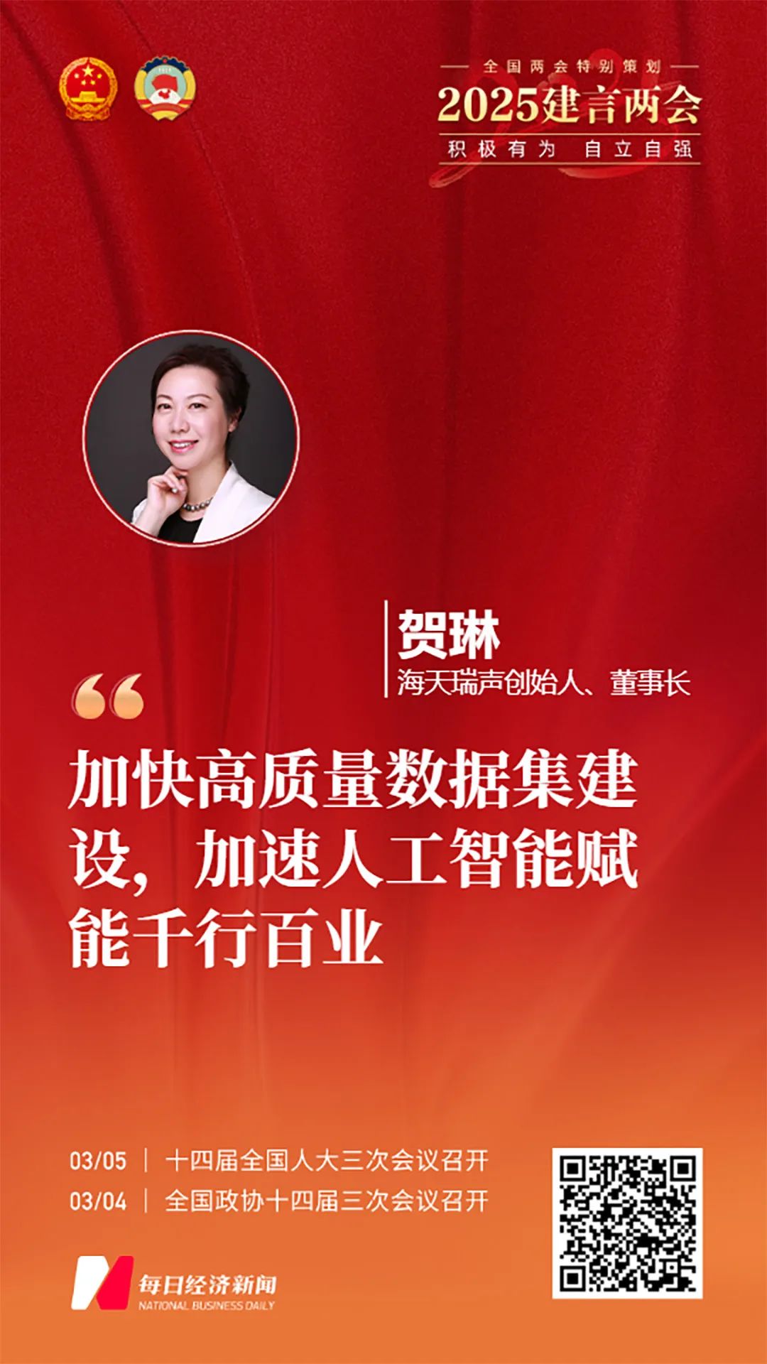 每日经济新闻《积极有为自立自强》2025建言两会专题中,海天瑞声创始人、董事长贺琳作为企业家代表建言“加快高质量数据集建设加速人工智能赋能千行百业”。