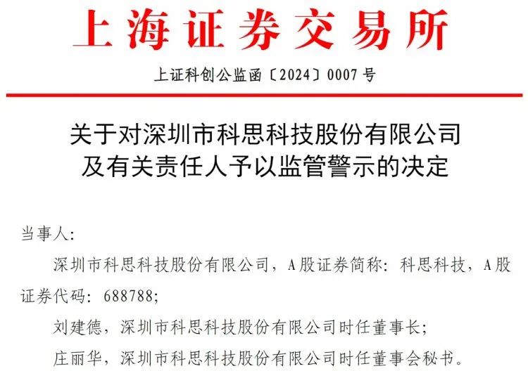 鉴于上述违规事实和情节,上交所作出如下监管措施决定:对深圳市科思科技股份有限公司,时任董事长刘建德及时任董事会秘书庄丽华予以监管警示。