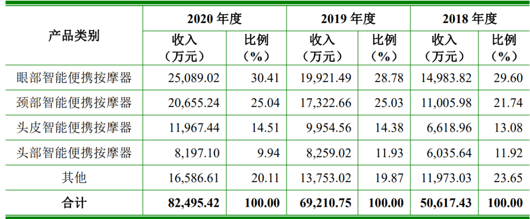 从几大业务营收占比可以看到,倍轻松的眼部和颈部智能便携按摩器合计占据收入的半壁江山,其中眼部按摩器2020年营收占比30.41%。