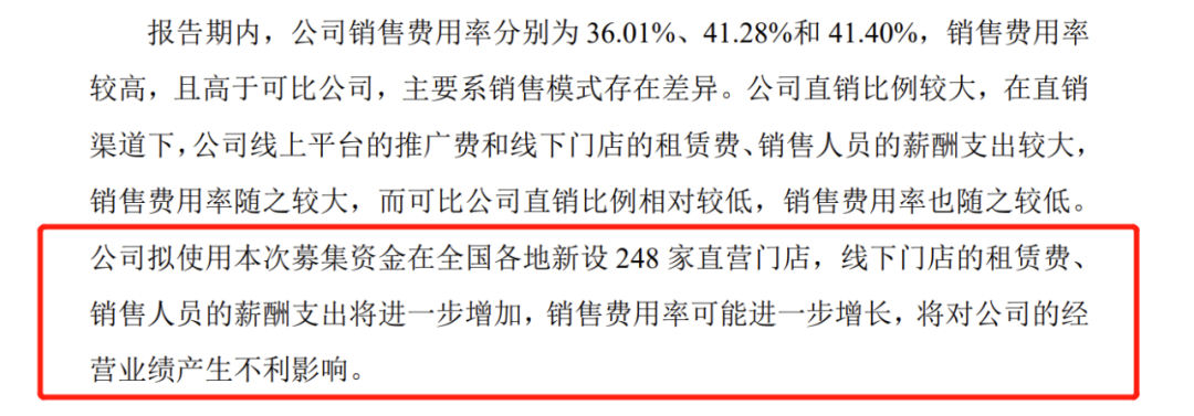 根据招股书,本次上市所募集资金将用于在全国各地新设248家直营门店,直接导致线下门店的租赁费、销售人员薪酬支出进一步增加,销售费用率进一步增长。