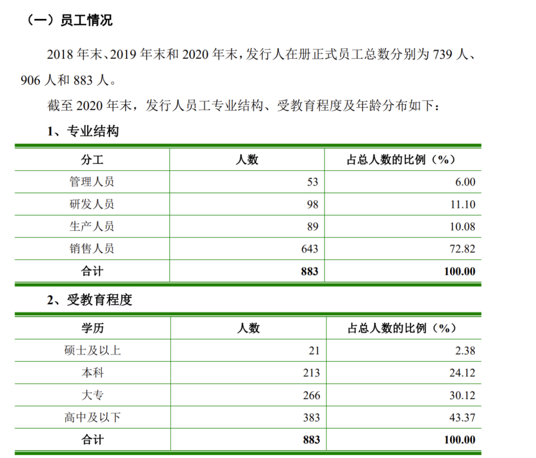 倍轻松2020年共有正式员工883人,其中研发人员仅98人,占比11.1%;销售人员占比却达到了惊人的72.82%,共643人。在受教育程度上,883名员工中获硕士及以上学历的21人,占比2.38%,而大专及以下学历占比则高达73.49%,共649人。