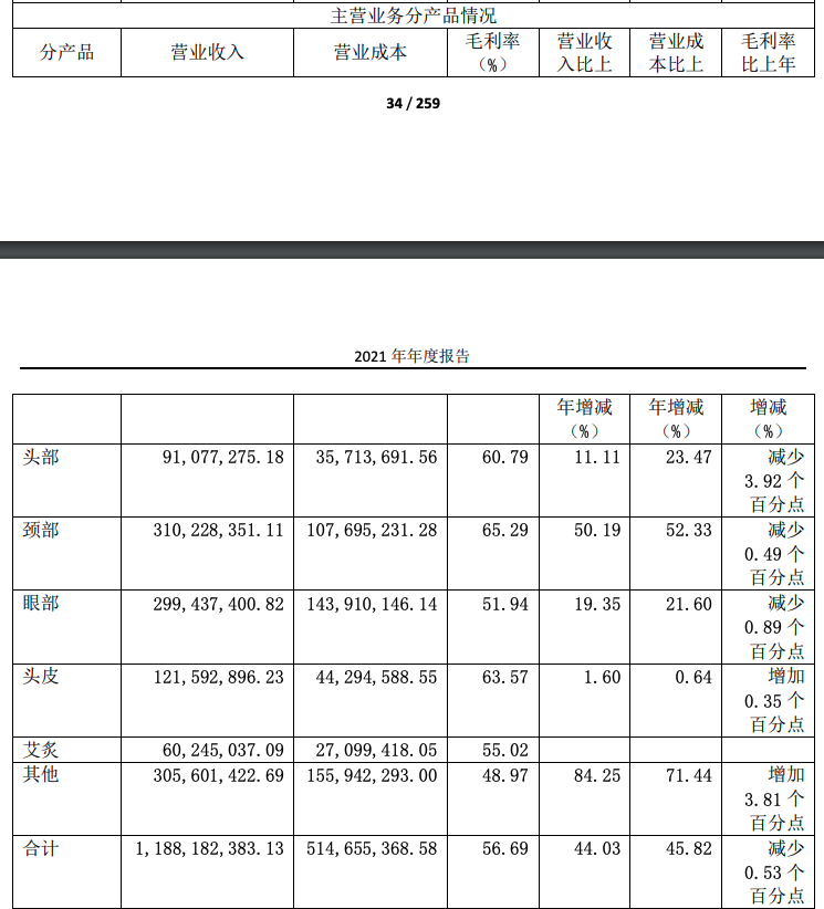 分产品看,倍轻松在财报中将产品细致分为头部、颈部、眼部、头皮、艾灸和其他。2021年,公司颈部产品收入最高,达到3.10亿元,同比提升50.19%;眼部产品收入达到2.99亿元,同比提升19.35%;2021年三季度公司新推出的艾灸产品收入达到6024.50万元,占总收入5%,这类产品属于带耗材运营,公司称易于降低获客成本、提升粘性。