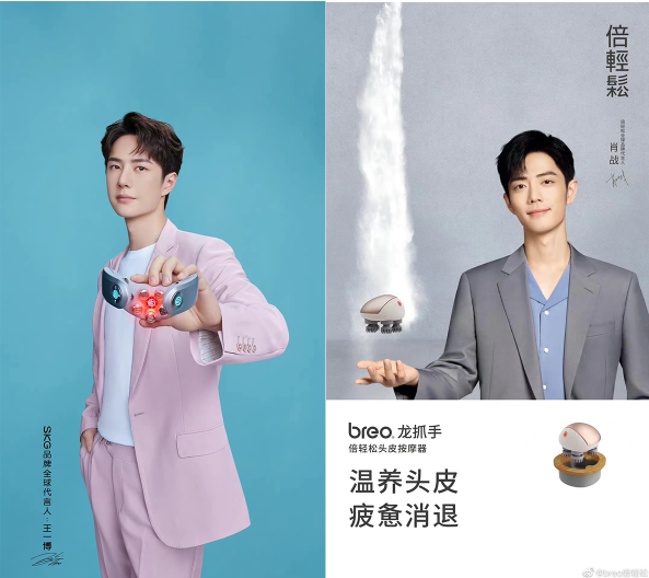 经过大手笔的电商化转型,如今倍轻松已有70%的收入来自线上,并重金聘请肖战作为代言人,而它的直接竞品SKG,代言人是王一博。