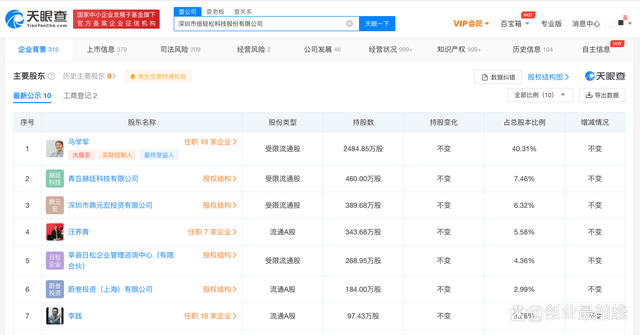 据天眼查信息显示,倍轻松所属深圳市倍轻松科技股份有限公司(下称“倍轻松”),成立于2000年,企业注册资本6164万人民币,实缴资本3364.3444万人民币,法人代表兼董事长马学军为公司大股东、实际控制人、最终受益人,其个人占总股本比例40.31%。