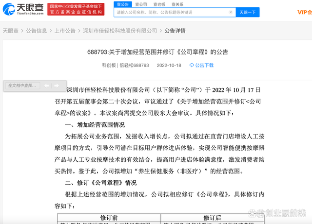 倍轻松表示,鉴于新增项目,公司拟增加“养生保健服务(非医疗)”的经营范围。
