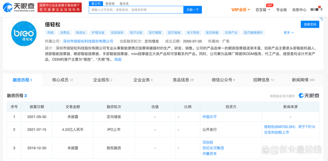 从2019年开始融资,倍轻松在2021年7月15日成功IPO上市,交易金额4.22亿人民币,并于2021年9月30日完成定向增发,投资方为中国太平。