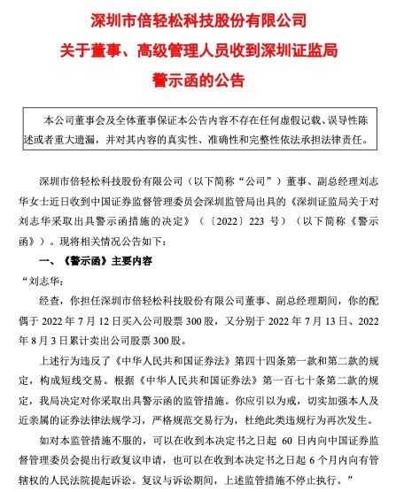 中国证监会网站1月4日公布深圳证监局关于对刘志华采取出具警示函措施的决定。警示函称,经查,刘志华担任深圳市倍轻松科技股份有限公司(以下简称“倍轻松”)董事、副总经理期间,其配偶于2022年7月12日买入公司股票300股,又分别于2022年7月13日、2022年8月3日累计卖出公司股票300股。本次短线交易获利金额为254.19元,刘志华之直系亲属蔡先生已主动将所获收益全数上交公司。