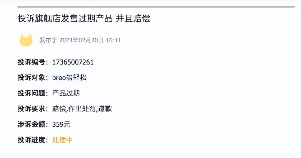 此外倍轻松还曾因为给消费者寄过期产品而遭到了投诉,据黑猫投诉[投诉入口]平台显示,今年2月20日,一位消费者发起投诉称倍轻松的旗舰店发售过期产品,他购买了一套艾灸理疗仪,收到货品后发现配套的艾条已过期,合理怀疑店里销售假货,以次充好。因此他发起投诉要求赔偿。