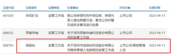 同日(4月11日),上交所向倍轻松下发《关于深圳市倍轻松科技股份有限公司高级管理人员辞职的监管工作函》,涉及对象为上市公司、高级管理人员。