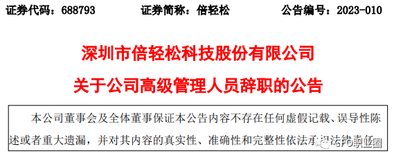 刚刚,倍轻松发布的《关于公司高级管理人员辞职的公告》显示,董事会于近日收到公司执行总经理、财务总监徐胜利先生的书面辞职报告。徐胜利先生因个人原因向公司申请辞去公司执行总经理、财务总监职务。