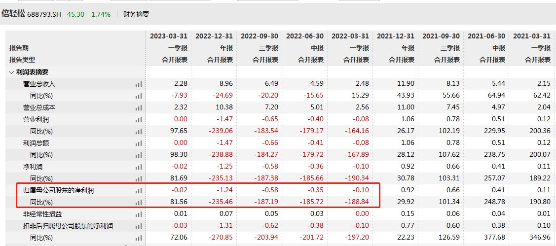2023年一季度,倍轻松实现营业收入2.28亿元,同比减少7.93%;净利润-182.35万元,同比增加81.56%。