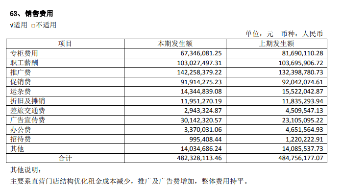 销售费用持平的原因基本为主要系直营门店结构优化租金成本减少,推广及广告费增加。