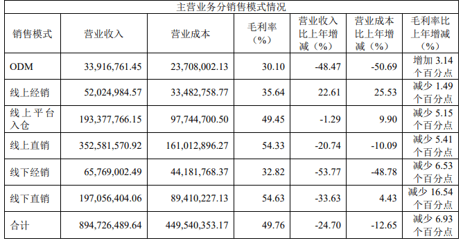 此外,ODM模式的2022年收入较上年近腰斩,为3391.68万元,同比下降48.47%。