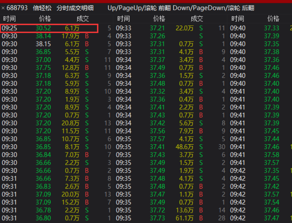 不过,自进入连续竞价阶段后,倍轻松股价快速拉起,9点30分连续竞价阶段的一笔成交价即达38.14元,这一价格较昨天收盘价仅跌0.03%,意味着连续竞价阶段该笔成交价与集合竞价成交价相差近20%。另外,统计数据也显示,自进入连续竞价阶段后,倍轻松的成交价就普遍在36元以上波动,与集合竞价阶段的成交价也相差甚远。