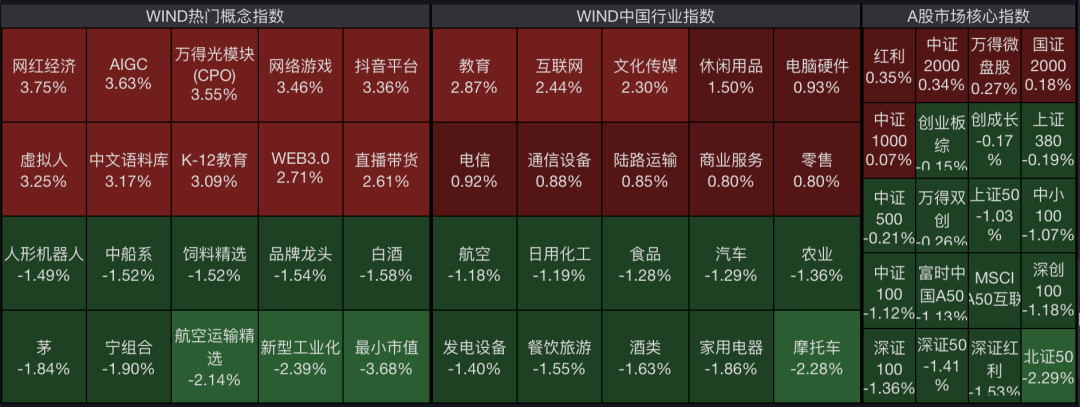 概念板块方面,短剧游戏、网红经济等概念领涨。猪肉等概念板块跌幅居前。