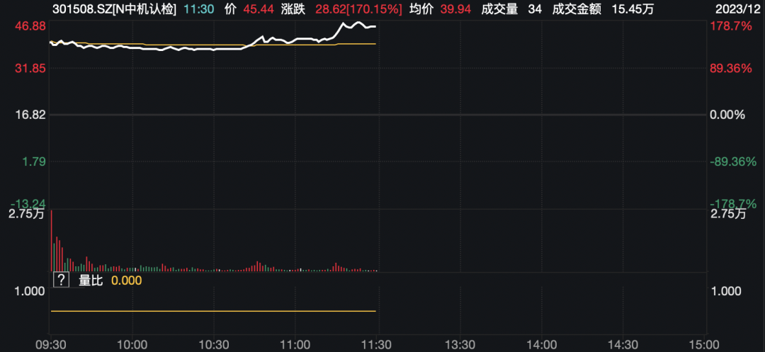 今天A股市场有一只新股上市,为中机认检,该股上午大涨,盘中涨幅一度高达178.72%。