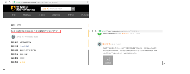 无独有偶,对于倍轻松抖音平台的销售,有网友于今年2月8日发布主题为《抖音倍轻松旗舰店刚买几天的最新款就变旧款了》的投诉帖子,显示:“我22号下单倍轻松n5minis ,当然下单最新款就是春节来送礼的,当时店铺上新也没预告这款在接下来会出新款,购买时也没告知这款n5minis在几天后将会有新款更新。结果才过几天就出了新款的n5minis,这明显就是欺诈行为。”