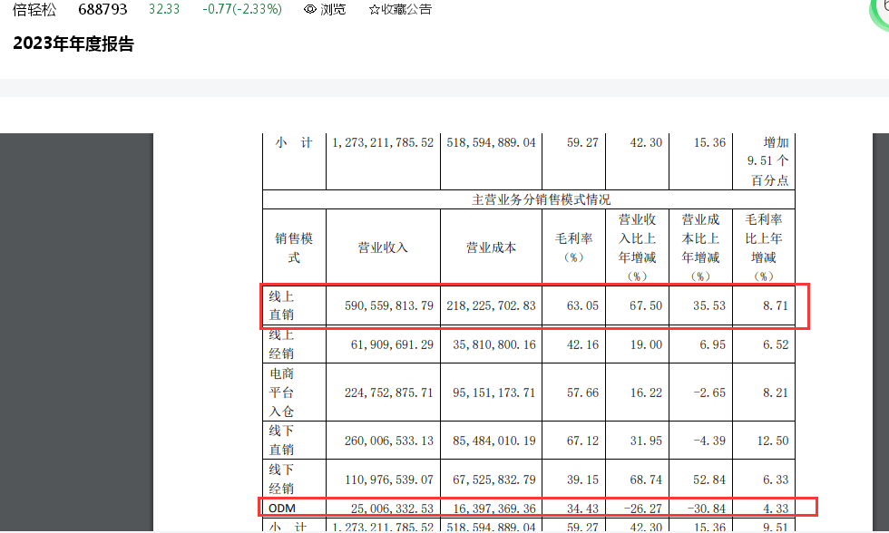 倍轻松表示,线下经销增长 68.74%主要原因是免税渠道、加盟业务和新增山姆渠道带来的增长;线上直销增长 67.50%主要原因是抖音平台的销售增长;ODM 收入同比下降 26.27%主要为海外主要客户的销售下降。