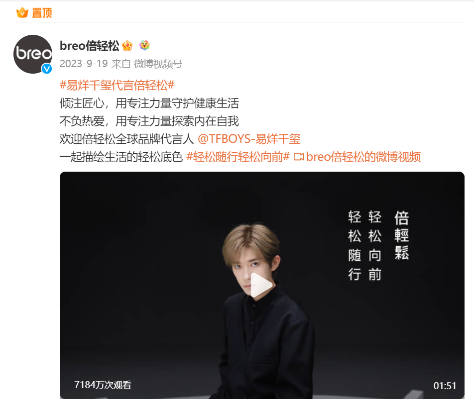 时代周报记者注意到,去年9月19日,倍轻松官宣,由当红艺人易烊千玺担任其全球品牌代言人。