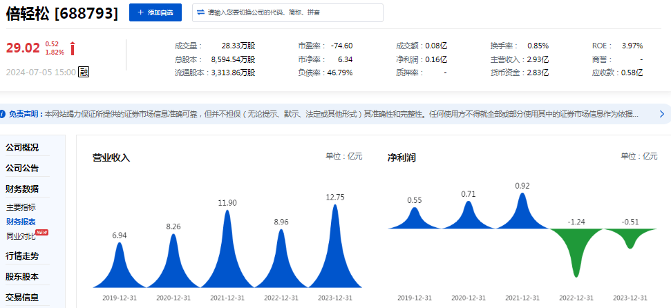 二级市场方面,倍轻松上述解禁公告披露后第二天即7月5日,倍轻松的股价走势呈现先跌后涨,截至下午三点收盘,倍轻松股价报收29.02元,收涨1.82%。