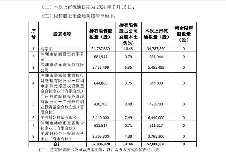 上述公告显示,该限售股股东包括控股股东、实际控制人马学军、深圳市鼎元宏投资有限公司、深圳市赫峰正富咨询合伙企业(有限合伙)、公司实际控制人控制的企业青岛赫廷科技有限公司、莘县日松企业管理咨询中心(有限合伙)、深圳市倍润投资有限公司、深圳市嘉信元德股权投资基金合伙企业(有限合伙)、广州丹麓创业投资基金合伙企业(有限合伙)。