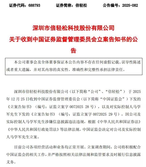 12月25日晚,倍轻松(证券代码:688793)发布公告显示,深圳市倍轻松科技股份有限公司于 2025年12月25日收到中国证监会下发的《立案告知书》(编号:证监立案字 0072025 28号),以及对实际控制人马学军先生下发的《立案告知书》(编号:证监立案字 007202529号),因公司及实际控制人马学军先生涉嫌信息披露违法违规,中国证监会决定对公司及实际控制人马学军先生立案。