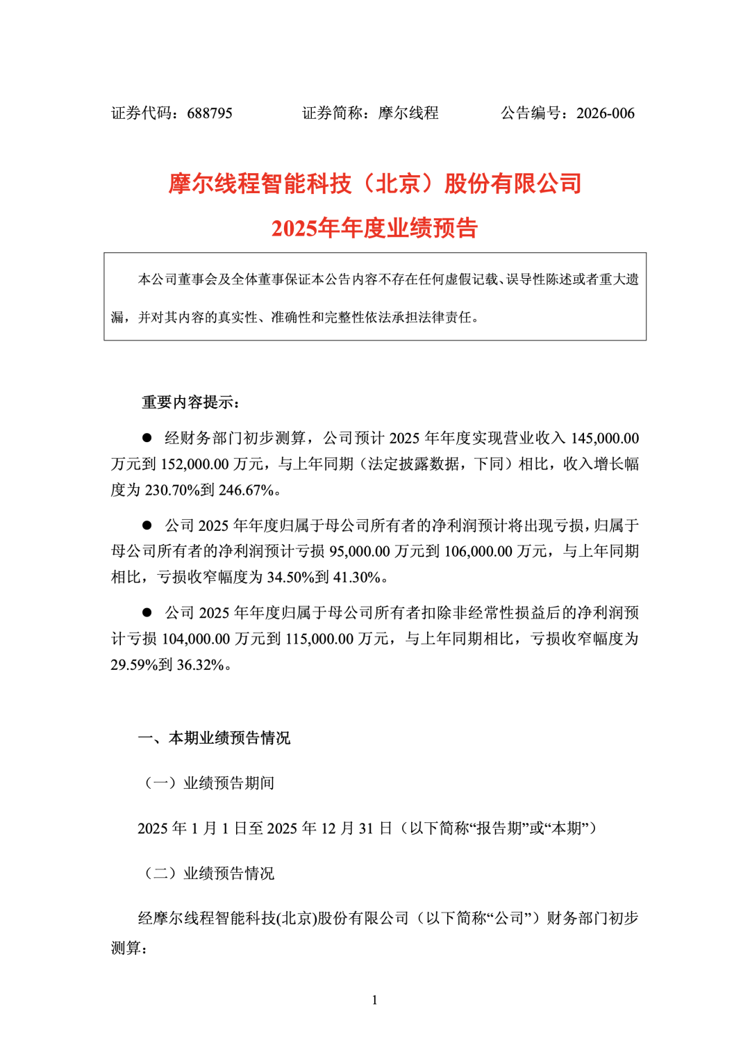 2026 年 1 月 21 日,摩尔线程智能科技(北京)股份有限公司发布《2025 年年度业绩预告》。