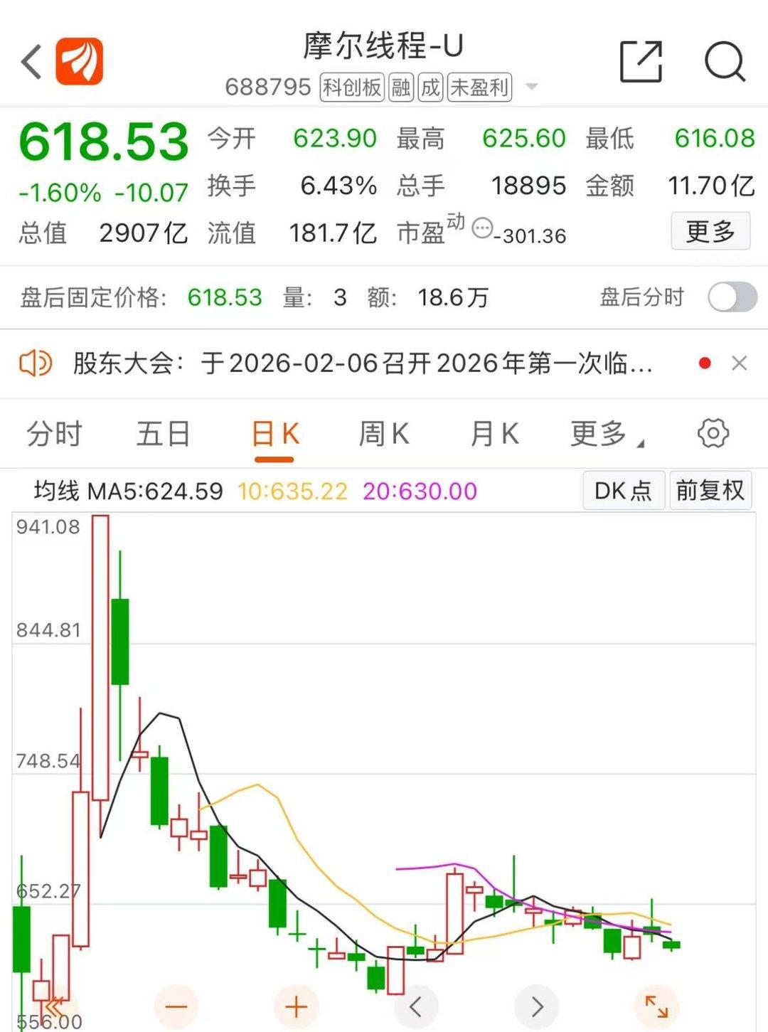 1月23日,“国产GPU第一股”摩尔线程收跌1.6%,报618.53元。此前该公司给出了一份喜忧参半的成绩单,2025年年度营收实现超过230%的增长,但净利润却仍将亏损约10亿元,上市仅一个多月市值蒸发千亿。