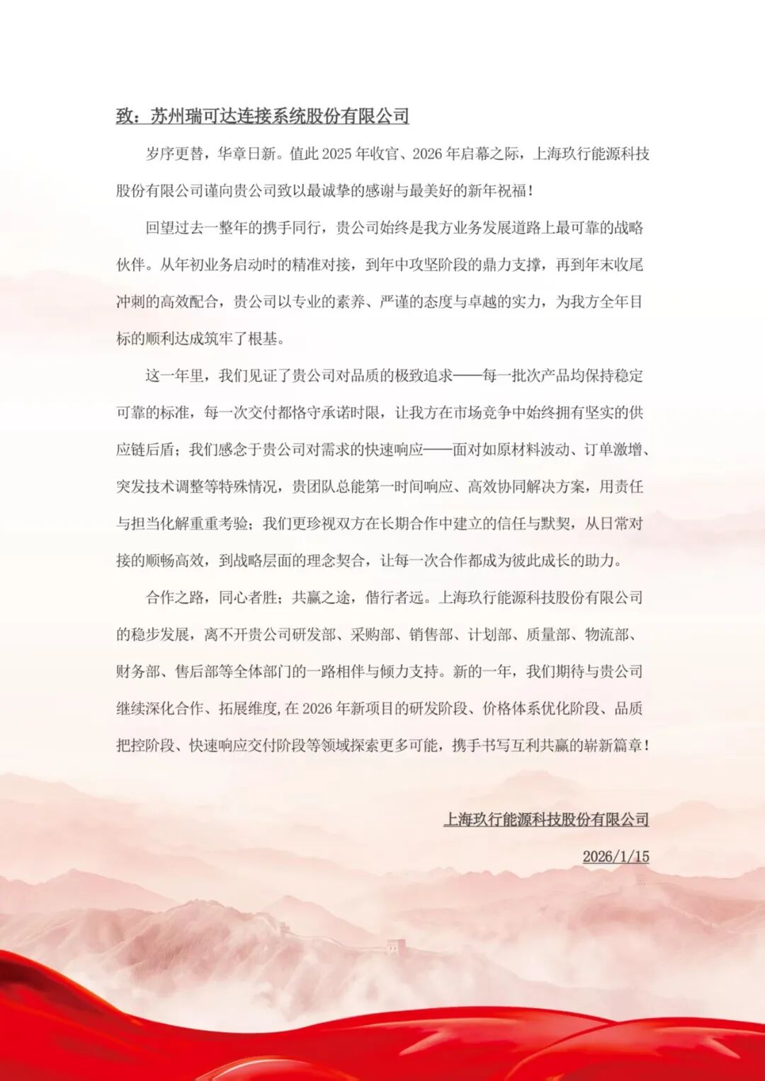 一纸感谢信,万般战友情。玖行能源在感谢信中提及,过去一整年的携手相伴,瑞可达始终是其业务发展道路上最可靠的战略伙伴。从年初业务启动时的精准对接,到年中攻坚阶段的鼎力支撑,再到年末收尾冲刺的高效配合,我们始终以专业的素养、严谨的态度与卓越的实力,为玖行能源全年目标的顺利达成筑牢了根基。