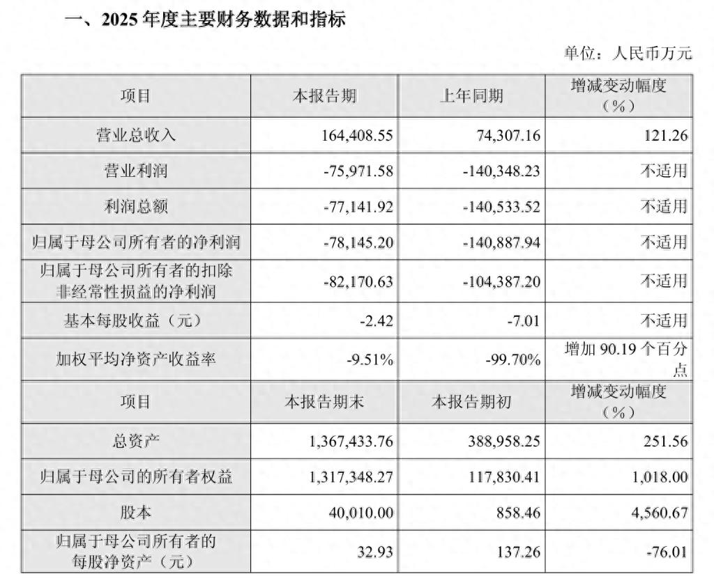 核心数据如下:营业总收入16.44亿元,较上年同期的7.43亿元增长121.26%。归属于母公司所有者的净利润为-7.81亿元,上年同期为-14.09亿元,亏损收窄44.53%。归属于母公司所有者的扣除非经常性损益的净利润为-8.22亿元,上年同期为-10.44亿元,亏损收窄21.28%。基本每股收益为-2.42元,上年同期为-7.01元。加权平均净资产收益率为-9.51%,上年同期为-99.70%,提升90.19个百分点。截至2025年末,公司总资产136.74亿元,较报告期初的38.90亿元增长251.56%。归属于母公司的所有者权益131.73亿元,较报告期初的11.78亿元增长1018.00%。