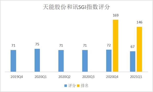 2021年一季度,天能股份在和讯SGI总榜名次有所上升,但公司指数评分同比大幅下滑,甚至不及各季度的。一季度,天能股份扣非净利润3.04亿元,但是扣非后净利润同比增长率却为-53.28%,远低于行业中位数。