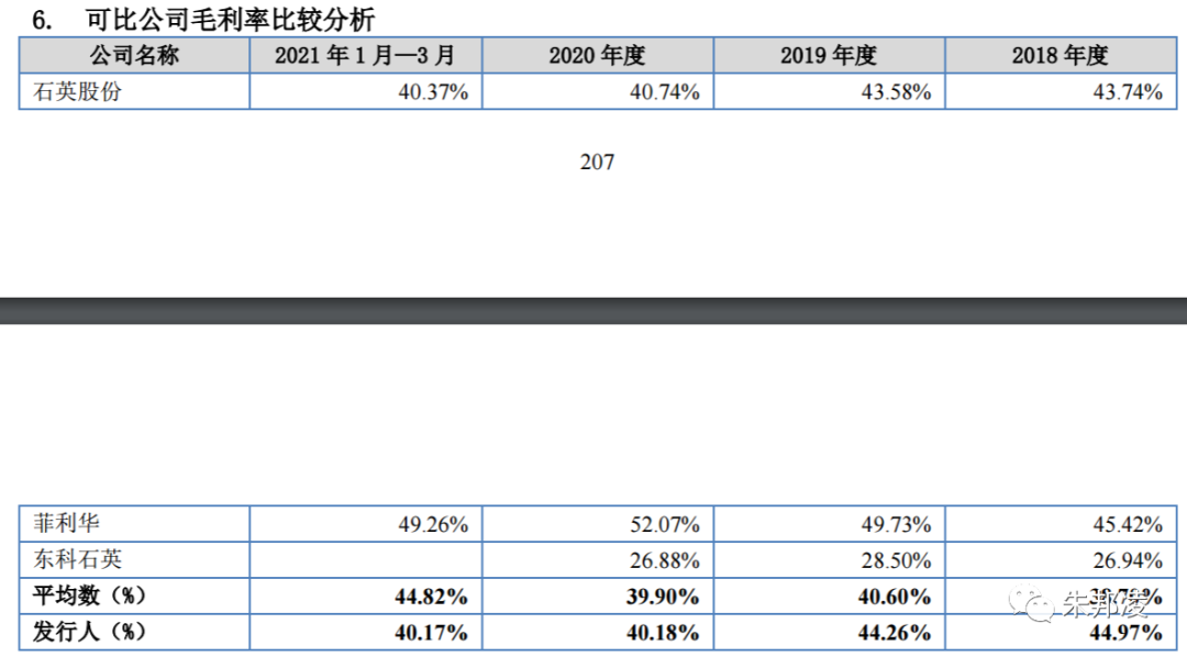 2018 年、2019 年、2020 年,公司毛利率分别为 44.97%、44.26%、40.18%,同行业可比上市公司平均销售毛利率分别为 38.70%、40.60%、39.90%。同行业可比公司石英股份、菲利华存在部分石英原料销售业务、部分石英产品销售业务,因两家上市公司的石英原料产品系国内较大的供应商,产品质量高,故其毛利水平也相对较高,两家上市公司同期毛利水平的波动主要系当期石英原料占当期业务比重不同导致的。同期新三板挂牌企业东科石英因其存在部分电子产品,为负毛利,导致其综合毛利低于本公司水平。