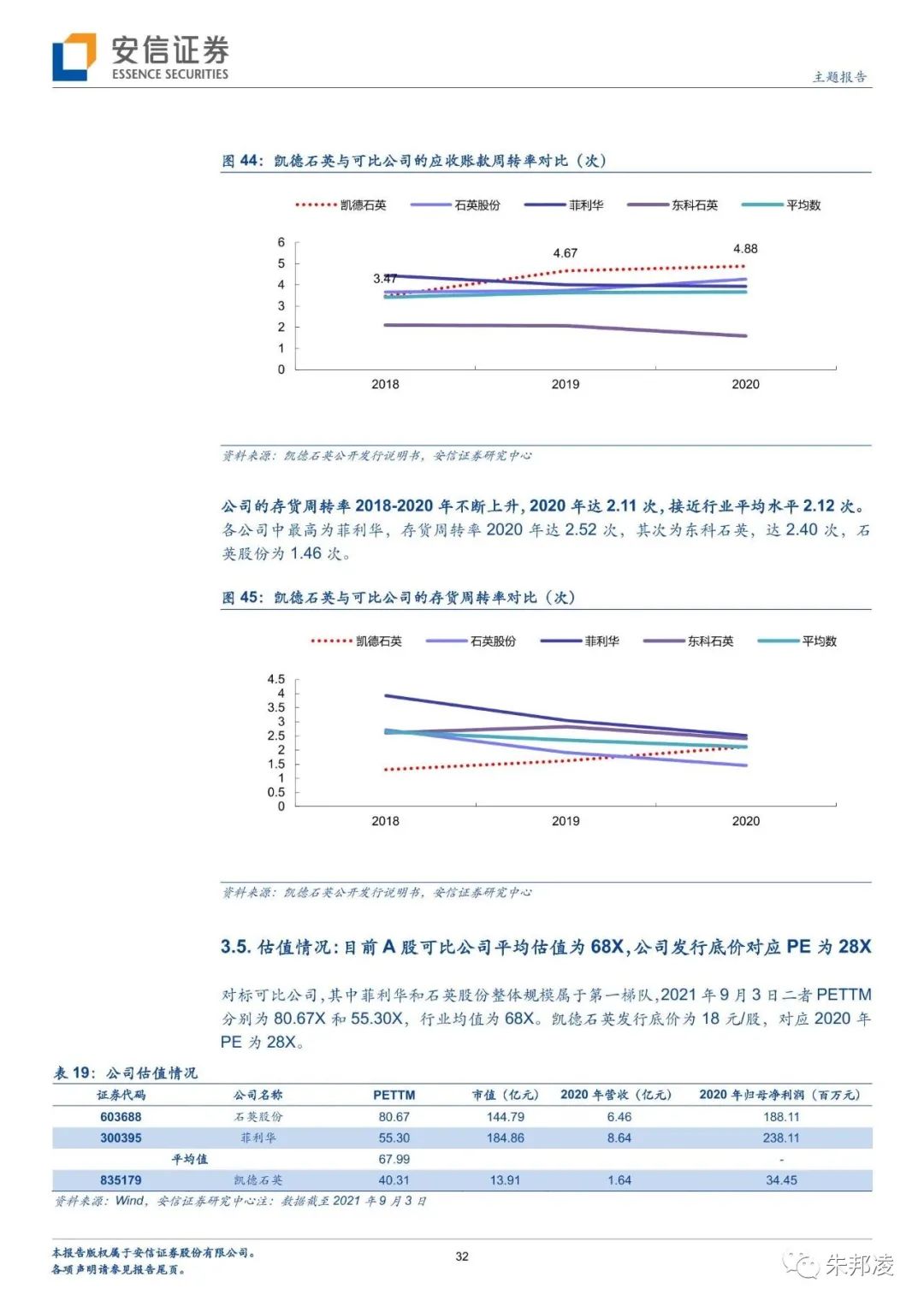 据安信证券研报,1)规模体量:石英股份和菲利华规模优势突出,公司业绩增长最快,近三年营收和归母净利润复合增速超过20%。2)盈利能力:菲利华、石英股份和公司毛利率较高,2020年公司毛利率为40.18%。公司净利率历年均高于平均水平,2020年为21.07%。3)费用水平:公司费用整体呈下降趋势,研发费用率高于平均水平,2020年为6.14%。4)营运能力:公司应收账款周转率2020年为4.88次,行业最高,存货周转率2020年为2.11次。5)估值情况:目前A股可比公司平均估值为68X,公司发行底价对应2020年PE为28X。