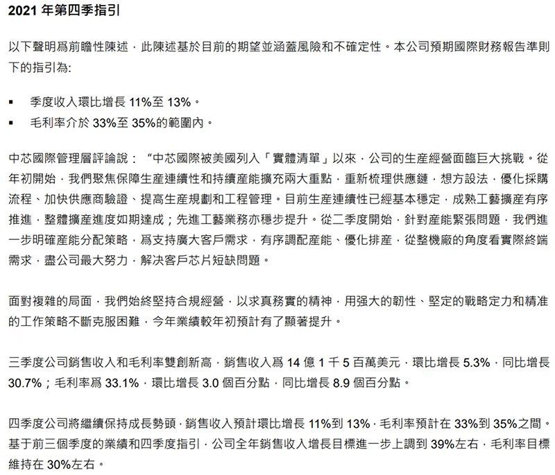 中芯国际同日发布了第四季度业绩指引。公司预计第四季度收入环比增长11%至13%,毛利率介于33%至35%。中芯国际第三季度毛利率为33.1%,环比增长3个百分点,同比增长8.9个百分点。