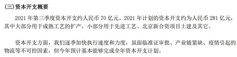 中芯国际在第三季度的资本开支约70亿元,2021年资本开支计划为281亿元,其中大部分用于成熟工艺的扩产,小部分用于先进工艺、北京新合资项目土建及其他。