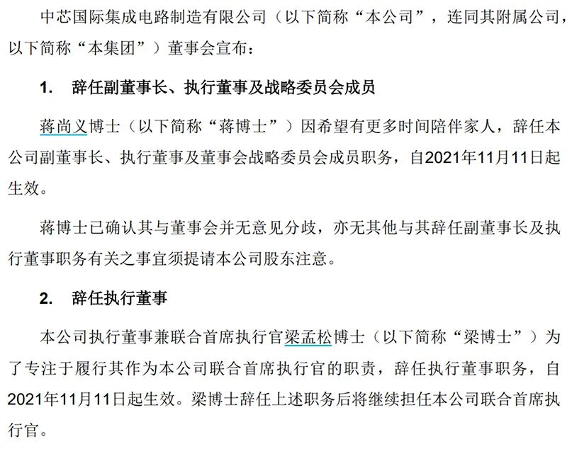 中芯国际披露,蒋尚义因希望有更多时间陪伴家人,辞任公司副董事长、执行董事及董事会战略委员会成员职务,自11月11日起生效。公司执行董事兼联合首席执行官梁孟松为专注于履行其作为公司联合首席执行官的职责,辞任执行董事职务。
