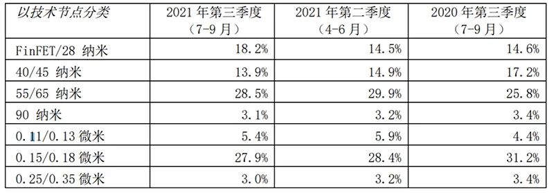需要重点提及的是,中芯国际先进制程业务占比再度大幅提升。数据显示,中芯国际FinFET/28nm节点业务在第三季度的占比达到了18.2%,同比2020年第三季度14.6%、环比今年第二季度14.5%,均有大幅增长。