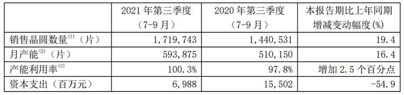 中芯国际披露,2021年第三季度销售晶圆数量1719743片,同比增长19.4%;月产能593875片,同比增长16.4%(均为折合8英寸晶圆)。尤其是,公司第三季度的产能利用率达到了100.3%,同比增加了2.5个百分点。充分显示出半导体产业的高景气度、晶圆代工产能的紧张。