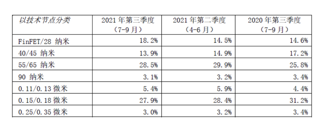 以技术节点来看,55/65纳米销售收入占比最高,达到28.5%,0.15/0.18微米销售收入紧随其后,达到27.9%。