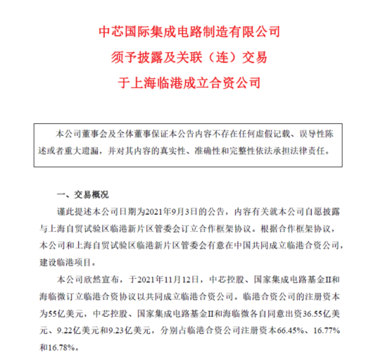 今日,中芯国际发布公告,中芯控股、国家集成电路基金II和海临微订立临港合资协议以共同成立临港合资公司。