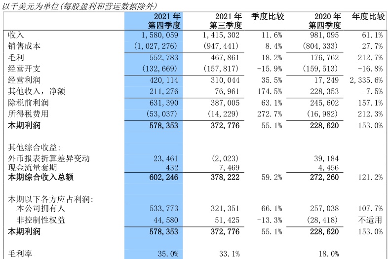 数据显示,2021年第四季度,中芯国际实现销售收入15.80亿美元(102.6亿元人民币),同比增长61.10%,环比增长11.64%,这也是公司单季销售收入首次超过15亿美元;公司实现净利润5.528亿美元(34.15亿元人民币),同比增长212.7%,环比增长18.2%。